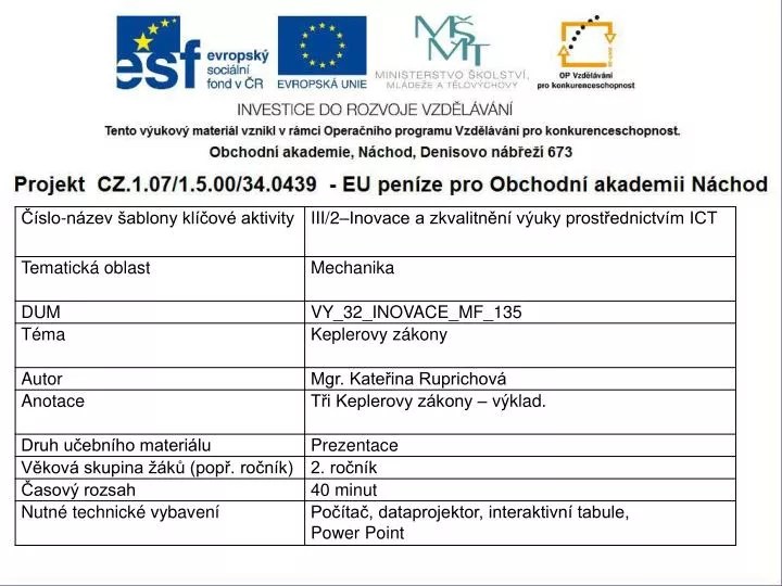 Keplerovy zákony se zabývají pohyby vesmírných těles, jako jsou např... Poměr druhých mocnin oběžných dob je roven poměru třetích mocnin hlavní poloosy. Planety se pohybují okolo slunce po elipsách, v jejichž jednom ohnisku je slunce 3. Kepler určoval objemy objemy těles vzniklých rotací kuželoseček. Planety se pohybují okolo slunce po elipsách, v jejichž jednom ohnisku je slunce 3.. Žák je schopen lépe pochopit problematiku řešní elektrických sítí a využít získané poznatky k řešení praktických úloh …